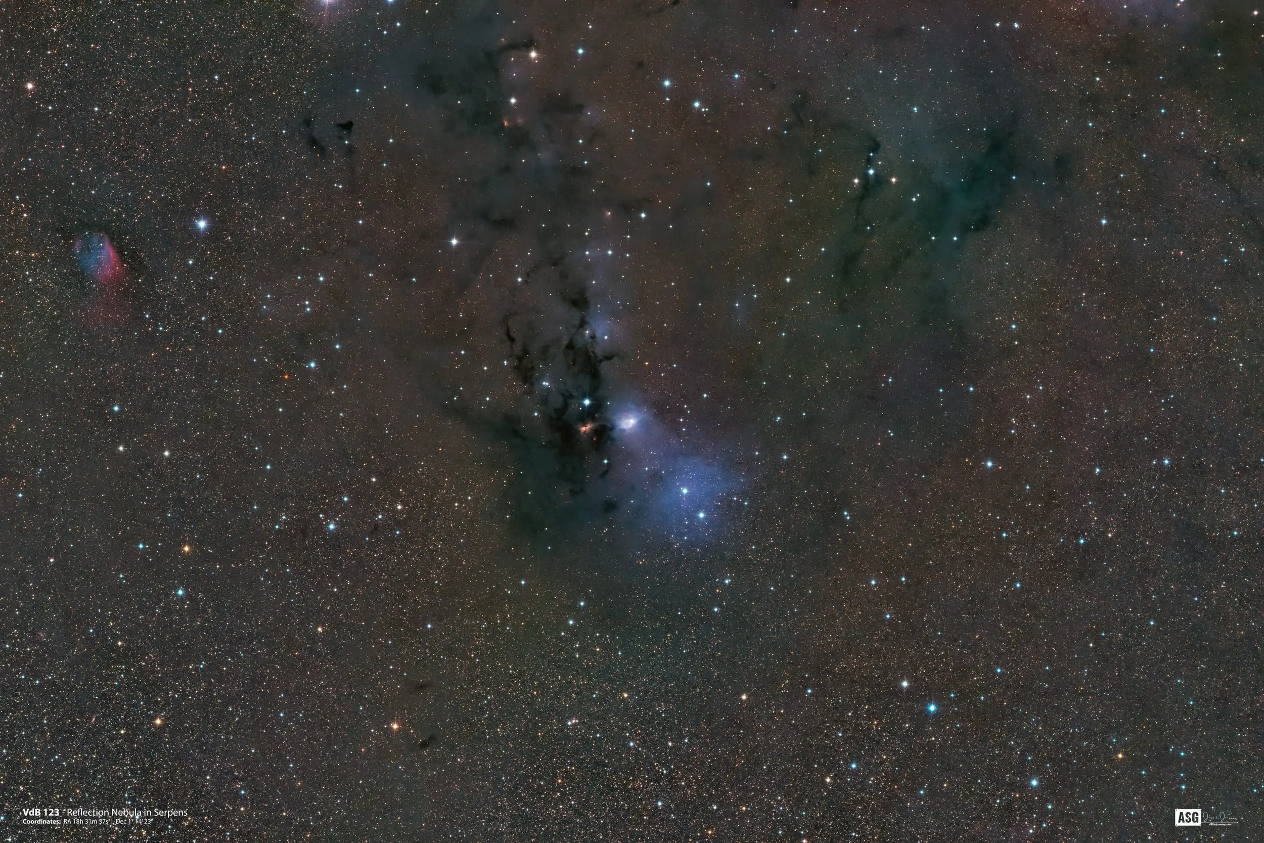 In the 1960’s, Sidney Van der Bergh classified 158 nebulae that had reflection nebula properties. VdB 123 is one of those reflective nebulae, which doesn’t have enough radiant energy to give its own light, but rather reflects the star color properties from nearby energy sources off dust and gas within the region. This bluish reflection region in the center is one of those reflective nebula.